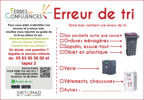 Une mauvaise répartition des déchets dans ces bacs peut entraîner des difficultés lors du traitement et compromettre la valorisation des matériaux. Dans ce contexte, nos agents de collecte peuvent être amenés à apposer une mention d’erreur de tri sur le bac concerné. Cette signalisation est ensuite suivie de l’envoi d’un courrier d’avertissement destiné à informer l’usager et à l’aider à corriger ses pratiques.